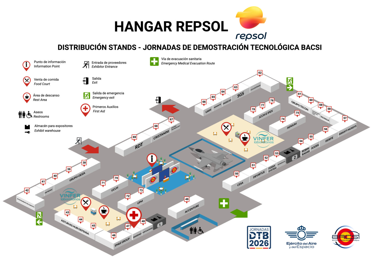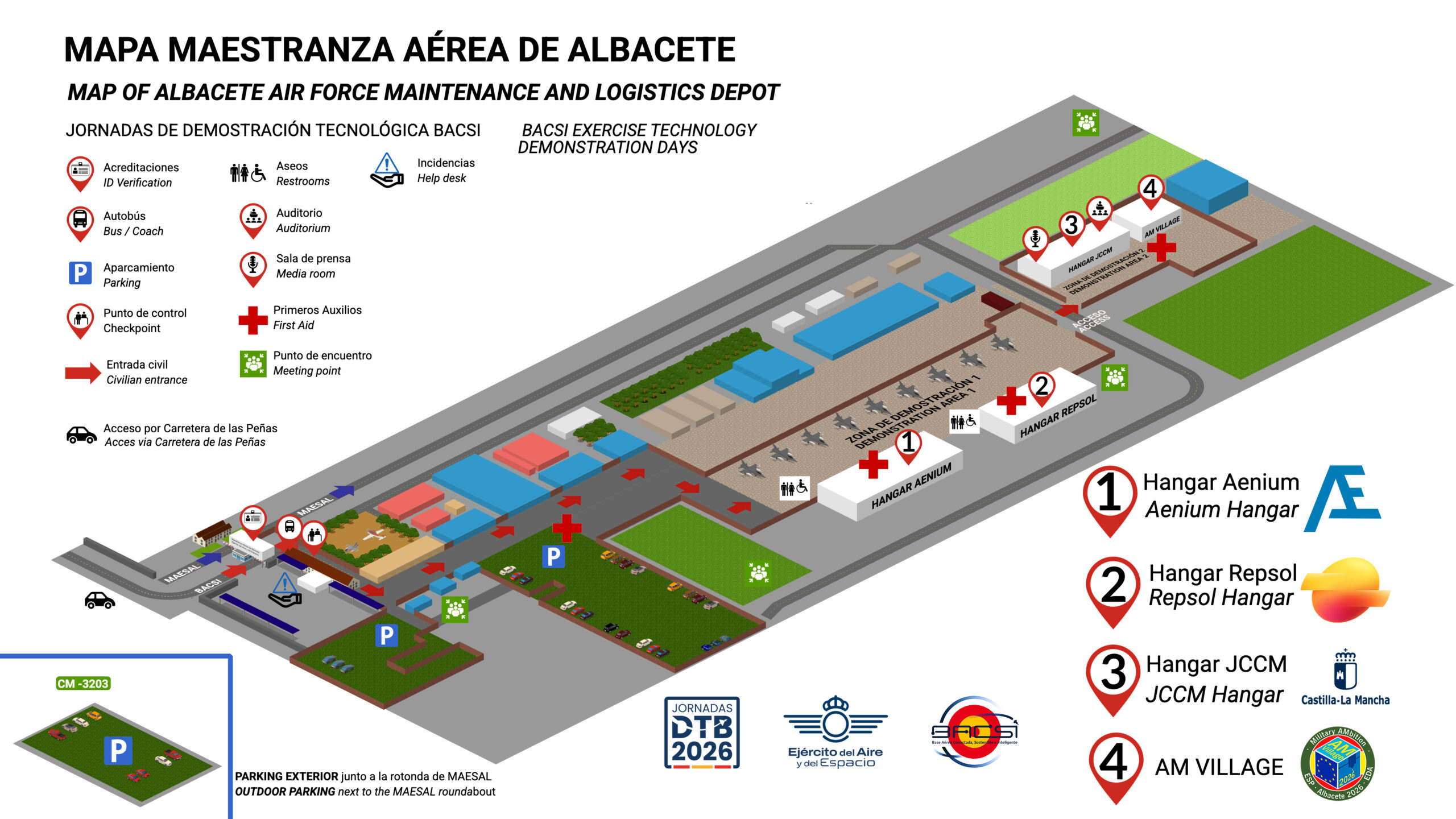 Para facilitar tu recorrido por BACSI, hemos diseñado un plano detallado con la distribución de los espacios. El recinto se divide en 3 hangares, 2 zonas de demostraciones y con acceso exclusivo al evento Internacional AMVillage 2026.
